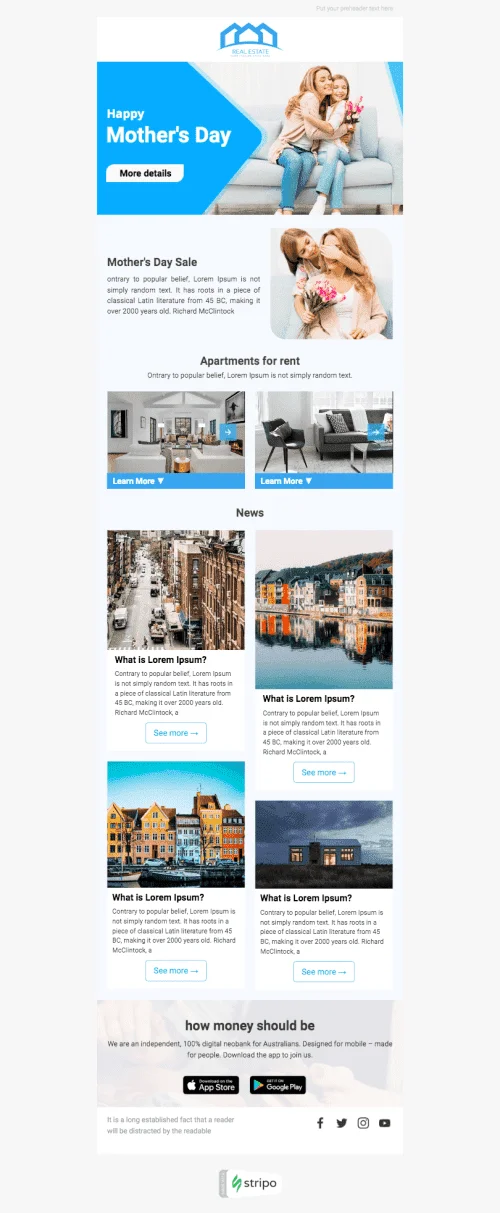 Trata a mamá con unas vacaciones especiales con nuestra plantilla de correo electrónico "Vacaciones de Mamá" diseñada para la industria inmobiliaria. Esta plantilla personalizable cuenta con secciones para mostrar tus últimas listas de casas y promociones, adaptadas específicamente para mamás que buscan la casa de sus sueños. Agrega un toque personal ofreciendo un descuento del Día de la Madre o mensaje personalizado para mostrar tu aprecio por todas las mamás trabajadoras que hay. El diseño elegante y moderno de esta plantilla seguramente atraerá e inspirará a tu audiencia. Con su formato fácil de usar, puedes crear un mensaje único del Día de la Madre que muestre las ofertas de tu marca y su dedicación a ayudar a las mamás a encontrar su hogar perfecto.
