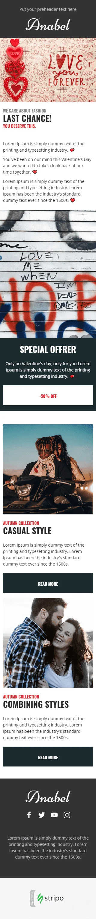 Notre modèle d'email « Love You Forever » pour la Saint-Valentin est parfait pour les marques de mode et les détaillants souhaitant mettre en avant leurs collections de la Saint-Valentin. Avec son design romantique et son langage persuasif, ce modèle inspire les lecteurs à exprimer leur amour et leur affection à travers la mode. Personnalisable avec votre propre message et votre image de marque, ce modèle est un moyen efficace d'augmenter les ventes et de susciter l'intérêt pour vos produits. Idéal pour les magasins de vêtements, les bijouteries et les détaillants d'accessoires, ce modèle est sûr d'attirer l'attention de ceux qui souhaitent faire une déclaration stylée en cette occasion spéciale.