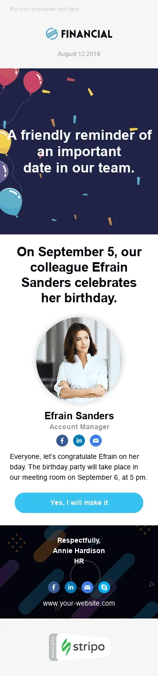 Modello Email Interne «Promemoria per il compleanno di un collega» per il settore industriale di HR