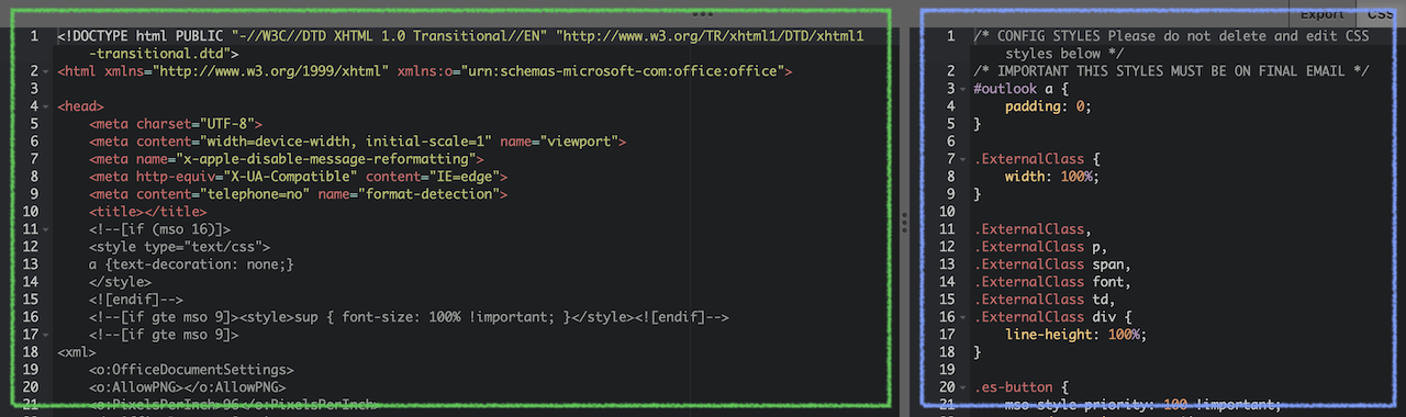 Define 2 containers for the Stripo settings panel (where controls will be located) and the Stripo preview area (the area where the rendered email template will be displayed).
