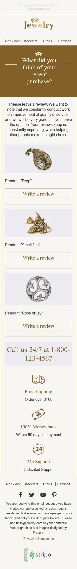 Modelo de E-mail de «Sua Opinião» de Compra recente para a indústria de Joalheria