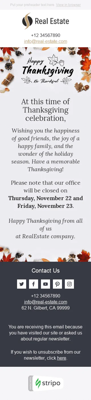 Шаблон письма к празднику День Благодарения "Замечательное время" для индустрии "Недвижимость"