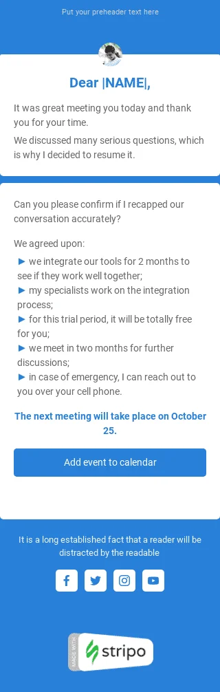 Шаблон листа «Дякую за зустріч» тематики Follow-up для індустрії «Бізнес»